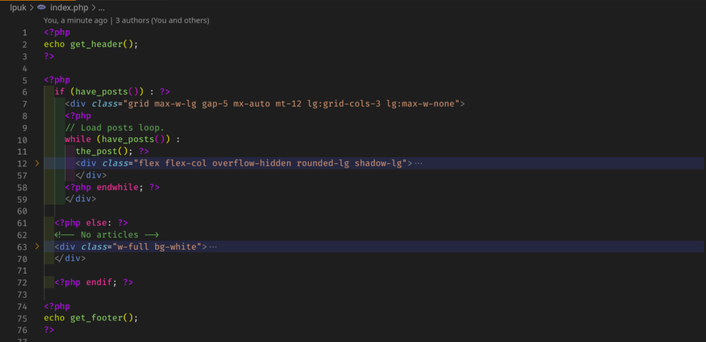Questo è il nostro loop; alla linea 6 controlliamo se abbiamo qualcosa (tutto è un post – o una tassonomia – in WP) su cui fare il loop, e alla riga 10/11 inizzializziamo il loop, chiuso alla linea 58.