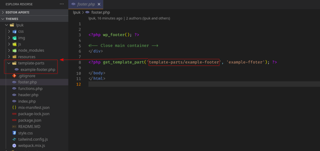 Se volessimo includere nostri template personalizzati, wordpress mette a disposizione la funzione get_template_part() che accetta come primo argomento il nome del file da richiamare; se il file si trova in una sottocartella, basta scrivere il percorso relativo partendo dalla root del tema.