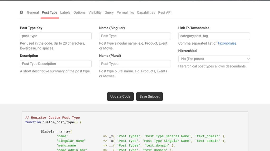 La documentazione WP ha una pagina dedicata a tutto questo discorso, con approfondimenti su come creare e implementare custom post type. Abbiamo però anche uno strumento online che ci velocizza il processo di creazione: generatewp.com. Andando alla voce “Post type” e riempiendo le varie tab con le nostre info, ci viene generato il codice da poter copiare/incollare nel nostro tema.