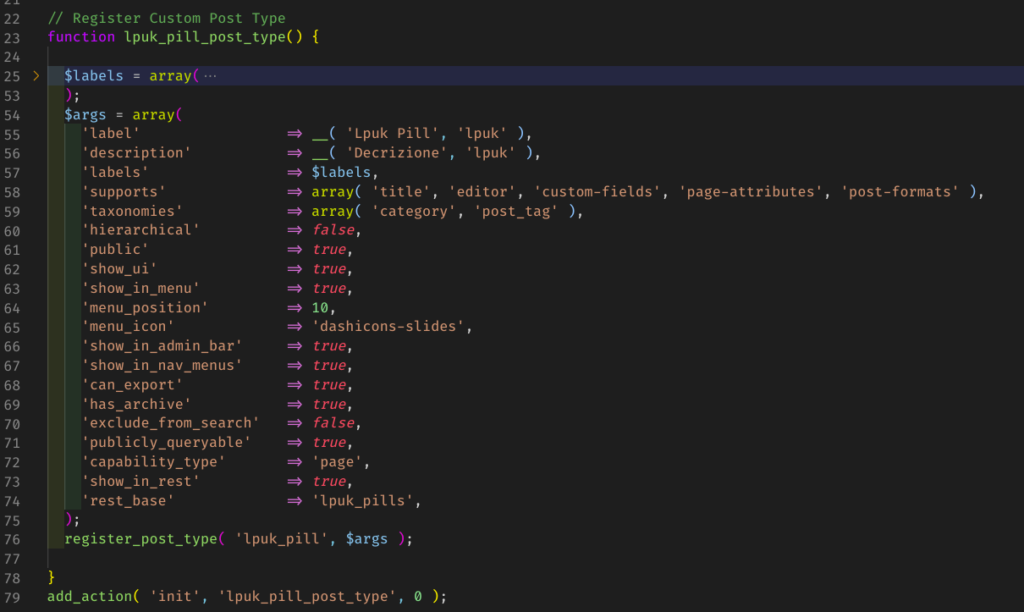 Spiegazione veloce del codice: all’avvio di WP registriamo il post type tramite la funzione register_post_type() a cui vengono passati una serie di opzioni (che definiamo visualmente tramite il sito).