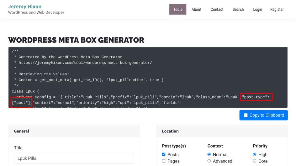 Fortunatamente Google ci è amico, e con una semplice ricerca si trovano diversi siti che generano il codice necessario partendo da un compositore visuale. Dopo averne provato qualcuno, la mia scelta è ricaduta sul sito di Jeremy Hyxon; settati tutti i campi che ci interssano, il tool genera uno snippet di codice che possiamo copiare/incollare nel nostro functions.php (anche se, al solito, conviene metterlo su un file esterno per mantenere il codice pulito).